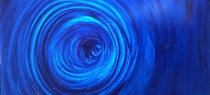 Last tuesday, when I picked up my brush, I heard a guide’s voice in my head: ‘start with blue.’ So I chose a cyan oil paint and started filling the board. Then, as I have often experienced in my healings, my hand started moving by itself in larger and larger cirkels. Next the voice said: ‘now take purple’. So, I mixed some magenta into the cyan and traced the circles again, this time in opposite direction. When I took back a step, shivers went down my spine as I recognised a Dragon’s eye at the end of a worm hole.